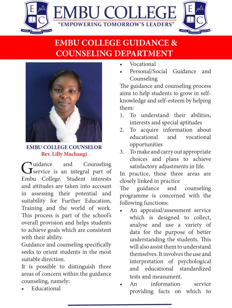 School Guidance and Counselling service is an integral part of Embu College. Student interests and attitudes are taken into account in assessing their potential